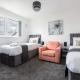 L'alloggio dispone di una cucina completamente attrezzata con frigorifero, forno tradizionale e microonde oltre al piano cottura e agli utensili necessari per preparare i pasti. Il soggiorno è arredato con un divano su pavimento moquettato riscaldato, le cinque posti letto sono distribuiti nelle tre camere da letto. Il bagno privato include doccia, set cortesia composto da shampoo, balsamo e prodotti da bagno gratuiti. Tra le dotazioni aggiuntive vi sono lavatrice, asciugamani e biancheria per la casa.